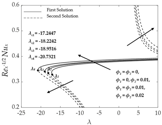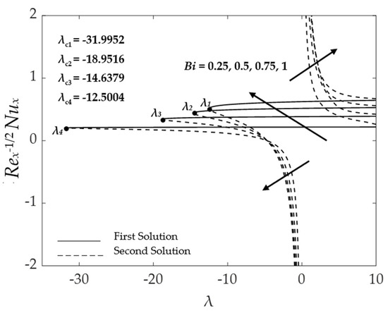 Effects of on the local Nusselt number with λ when , , and is shown in Figure 19. Physically, Biot number Bi is expressed as the measure of the interaction between convection at the surface of the body and conduction in the solid. There is an increase in the HTR for an increasing value of the Bi. As the Bi rises, the surface’s heat resistance decreases noticeably. Increased convection is the cause of the increased surface temperature. Additionally, the ratio that controls a body’s internal temperature changes significantly as the body warms or cools over time when a thermal gradient is applied to the surface. The critical values for the = 0.25, 0.5, 0.75, 1 are = −31.9952, −18.9516, −14.6379, and −12.5004, respectively.