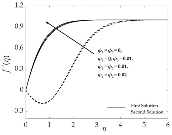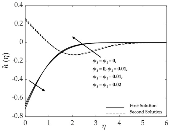 The effects of the hybrid nanoparticle volume fraction on the profiles are illustrated in Figure 10, Figure 11 and Figure 12 for the water , the nanofluid , and the HNF . It is discovered that increasing the hybrid nanoparticles value causes the velocity profile as well as microrotation profile to rise for both solutions. However, the microrotation profile shows that the first solution depreciates at the beginning . The thickness of the momentum boundary layer decreases for both profiles due to the increased nanoparticle concentration. Hence, the fluid flow velocity escalates. Furthermore, as the hybrid nanoparticle volume fraction rises, the temperature profile for both outcomes decreases, and the thickness of the thermal boundary layer increases. Physically, HNF is a novel type of conventional fluid that has greater heat transfer enhancement (refer to Devi and Devi [35]; Suresh et al. [45]), perhaps due to the impacts on magnetic properties and the Biot number, which indicate that the consequence will be the reverse.
