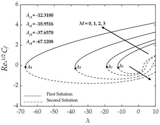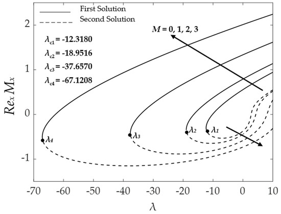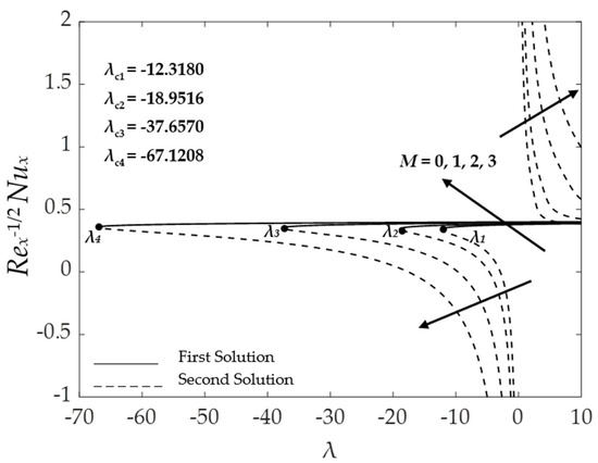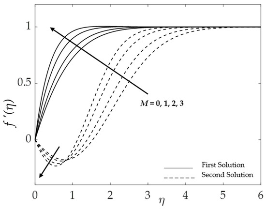 In addition, Figure 13, Figure 14 and Figure 15 display the changes in the values of ,, and , for some values of . The critical values for the magnetic parameters M = 0, 1, 2, and 3 are = −12.3180, −18.9516, −37.6570, and −67.1208, respectively. It is observed that the presence of a magnetic field enhances the values of these physical quantities for the first solution but shows contrast for the second solution. The applied magnetic field exerts viscous drag forces on the flow field, which slows down the fluid’s motion and raises the skin friction coefficient as well as heat transfer on the surface. This is because the fluid’s flow is slowed down by the Lorentz force, which also creates a resistive force against it and, consequently, reduces the fluid velocity. Lorentz force also can be defined as the force exerted on a charged particle moving with velocity through an electric field and magnetic field.