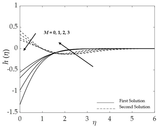 Influence of M on h(η) when K = 1, Bi = n = 0.5, ϕ1 = ϕ2 = 0.01, and λ = 1.