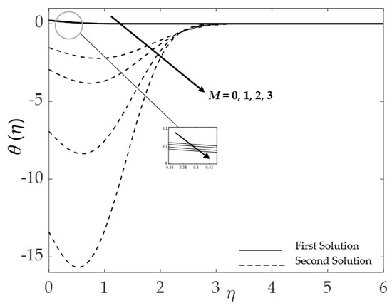 Further, the effects on the profiles for some values of when , Bi = n = 0.5, , and are depicted in Figure 16, Figure 17 and Figure 18. It is found that the velocity profiles augment the larger values of magnetic parameters. As the magnetic parameter rises, the momentum boundary layer thins, resulting in delayed flow, which raises the fluid flow velocity. By referring to the delayed flow here, the magnetic parameter plays a role as a fluid flow controller that could prevent the occurrence of turbulence flow. This outcome is in line with that displayed in Figure 13. Meanwhile, the microrotation profiles elevate for both branches when the magnetic parameter increases. However, for the second solution, microrotation and velocity profiles reduce for the range of and then monotonically increase for the range of . The high intensity of the magnetic field could also boost the rotation of the particles on the surface and, hence, increase the microrotation profile. Further, Figure 18 shows that as the magnetic parameter increases, the temperature profile decreases. The increase in the heat flux was caused by a reduction in the thermal boundary thickness. This result is consistent with Figure 15’s illustration.