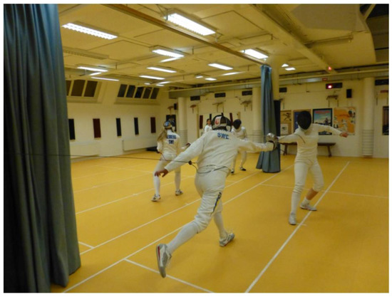 Right-handed fencers illustrating that the right hemithorax is more exposed when lunging with a weapon (Photo: Johan Harmenberg).