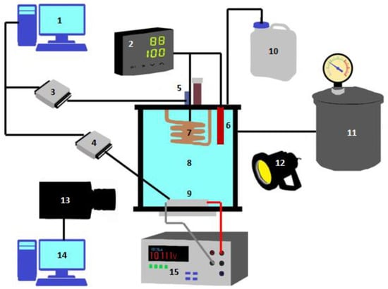 Scheme of the in-house developed setup: 1—PC 1, 2—PID controller, 3—DAC 1, 4—DAC 2, 5—Pressure transducer, 6—Cartridge heater, 7—Coil heater, 8—Pool boiling chamber, 9—Sample holder, 10—Condensate container, 11—Degassing station, 12—Light projector, 13—High-speed camera, 14—PC 2, 15—DC voltage source.