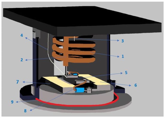 Scheme of the more detailed pool boiling chamber with the main components: 1—Heating coil, 2—Heating cartridge, 3, 4—Type K thermocouples, 5—Testing Surface, 6—Kapton® insulating tape, 7—Testing surface base, 8—Copper wire, 9—O-ring.