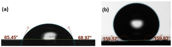 The biphilic surfaces were characterized by their wettability, evaluated through the static water contact angle measurement by optical tensiometry. Hence, the equilibrium static contact angle (Ɵ) was measured using the THETA™ tensiometer from Attension. A DW sessile drop of 5 µL was deposited at room temperature on the hydrophilic and superhydrophobic surfaces, and a 10 to 12 fps video was captured by the OneAttension v. 4.1 software. This software uses a drop detection algorithm, which is based on the Young–Laplace equation. The procedure to obtain the final contact angle value involved the value averaged over at least ten different measurements from representative areas of the surfaces. The final average values of the measured contact angles and corresponding standard deviations (SDV) are shown in Table 5. Figure 4 illustrates the contact angle measurements for both regions of the biphilic surface. Previous work, e.g., [,], checked for possible aging effects based on contact angle measurements before and after the experimental tests. The results did not show any significant change in the wettability which could be related to surface aging.