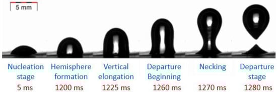 One of the main objectives of the present work was the production of biphilic surfaces with only one superhydrophobic region with a variable diameter. This procedure resulted in a more accurate evaluation of the bubble dynamics. We also intended to develop superhydrophobic spot matrixes with a diameter of less than 1 mm. First, we evaluated the dynamic behavior of the bubbles. Figure 5 presents the different stages of the development of the bubbles generated in the largest tested circular superhydrophobic region with a diameter of 5.2 mm. The figure shows the high-speed images of the fundamental evolution stages of a bubble from its nucleation to its departure from the heat transfer surface: the nucleation stage, hemisphere formation, vertical elongation, departure beginning, necking, and departure or detachment from the heating surface. On the first image on the left, the bubble is at the early nucleation stage after the departure of the preceding bubble, and the corresponding nucleation waiting time is 5 ms. As seen in the second and third images, the bubble formed a hemisphere, which is vertically elongated in the two following Images. This effect is due to the prevalence of the impulsion forces over the adhesion forces present. It should be noted that the growing of the bubble is restricted to the superhydrophobic region and, consequently, the relative weight of the surface tension forces can be attributed to the geometry and size of that region. Additionally, the boundary region between the hydrophilic and superhydrophobic regions of the biphilic surface also has a considerable influence on the set of the forces present. In the period between 1200 ms and 1225 ms, the departure of the bubble started, and the surface tension forces promoted the necking of the base of the bubble, which gradually developed until the departure of the bubble. On the two following images corresponding to 1260 ms and 1270 ms, the departure of the bubble is eminent, with only a small connection between the base of the bubble and its upper part, resulting from a sharp necking. This necking of the base of the bubble promotes, by the vapor mass conservation law inside the bubble, an acceleration of the vapor to the zone of the bubble, which results in a complete detachment of the bubble from the heating surface. At the moment of departure, 1280 ms, a vapor layer was left behind on the superhydrophobic region. This time evolution of the bubble is consistent with findings reported by Teodori et al. []. It is also proper to state that the last stages of the evolution of the bubble were carried out in a very short period, 80 ms, as compared to the total time required for the nucleation and development of the bubble. The vapor mass left deposited on the heating surface may be due to the fact that in the superhydrophobic region, there is no solid–vapor–liquid surface tension component that favors the detachment of that vapor mass from the surface. Hence, and considering that the nucleation of a bubble in a superhydrophobic region can occur at a temperature between 1 °C and 3 °C higher than the saturation temperature, the fast nucleation and coalescence of microscale bubbles produces a continuous vapor film over the superhydrophobic region. These mechanisms were also detailed by Malavasi et al. [] and Teodori et al. [].