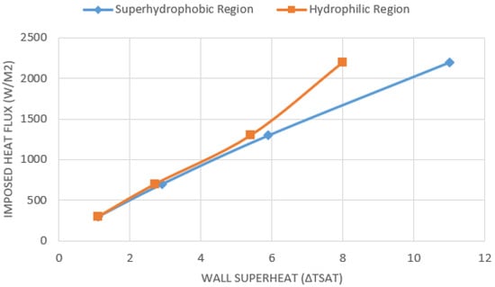 In sum, the bubble diameter is constrained by the diameter of the circular superhydrophobic spot, growing up to the limit of the boundaries between the superhydrophobic spot and the remaining hydrophilic surface. Additionally, given that there are no surface tension forces acting on the superhydrophobic spots contributing to the detachment of the bubble, these forces mainly act at the boundary of the superhydrophobic spots. Therefore, for smaller superhydrophobic spots, the necking occurs earlier, and the departure frequency of the bubbles increases. As the bubble detaches from the heating surface, the superhydrophobic spots are instantly covered by a new vapor layer, and there is no quenching promoted by the rewetting of the liquid on the superhydrophobic spots. Nevertheless, the liquid in the larger hydrophilic region may flow, promoted by the bubble departure and coalescence processes. Moreover, the bubble departure frequency and the bubble diameter are affected by the balance between the adhesive forces related to the surface tension at the boundary of the superhydrophobic spots and the buoyancy forces, which are also linked to the size of the superhydrophobic spots. The balance of the forces in play may affect the interaction or coalescence of the vapor bubbles and, consequently, contribute to the latent heat of evaporation and induced heat transfer by convection. Additionally, we observed a larger bubble departure diameter in the larger superhydrophobic areas, which can be explained by the fact that in these larger areas, the surface tension forces act only in the boundary of the superhydrophobic/hydrophilic regions. Hence, the bubble grows freely in the superhydrophobic spot, and the surface tension forces can also act at later growth stages, delaying the detachment of the bubbles. Furthermore, it should be noted that it has already been demonstrated that the superhydrophobic regions attract the vapor, thus contributing to the onset of nucleate boiling just 1-3K above saturation, as reported by Malavasi et al. [] and Teodori et al. []. Hence, the superhydrophobic regions act as nucleation sites, where boiling starts just 1-3K above saturation. The maximum superheating values obtained for the range of imposed heat flux and for the configuration used here are of the order of 4K–8K (e.g., [,]). Furthermore, the bubbles stay constrained inside the hydrophobic regions, as observed in the present work. Nonetheless, it can be stated that the superheating at the boiling surface can affect the shape and dynamics behavior of the vapor bubbles. A high superheat may lead to the formation of large and unstable bubbles, which are more difficult to control than smaller bubbles. The general effects of an increased superheat on the shape and behavior of the bubbles in film boiling are influenced by several factors such as the geometry of the heat transfer surface, thermophysical properties of the operating fluid, and the specific superheating conditions. At high superheats, the bubbles present irregular shapes, which can affect the heat transfer capability of the system and the behavior of the vapor film. Moreover, at high superheats, a second bubble of small size is formed immediately after the detachment of the first bubble. After that, a third bubble of small size is formed, and after a very small fraction of time, the first and second bubble coalesce and merge into a larger bubble. This one detaches from the surface, and a new bubble with the same dimension is formed as the third one detaches from the surface. This bubble dynamics pattern continues with the detachment of more bubbles, disturbing the vapor film and leading to an enhanced heat transfer capability. At high superheats, a large amount of vapor is generated, and the bubbles burst with different sizes, forming a vapor blanket over the heating surface, inducing film boiling or Leidenfrost boiling. Additionally, the high values of the superheat lead to the rapid formation of vapor, which causes the attachment of the bubbles to the vapor blanket. In addition, the increase in the superheat implies an increase in the bubble detachment frequencies. Superheating plays a very important role in augmenting the frequency of the detachment of the bubbles, thereby increasing the heat flux. The imposed heat flux vs. superheat curves for the hydrophilic region and superhydrophobic region, with a diameter of 5.2 mm, of the biphilic surface are presented in Figure 6.
