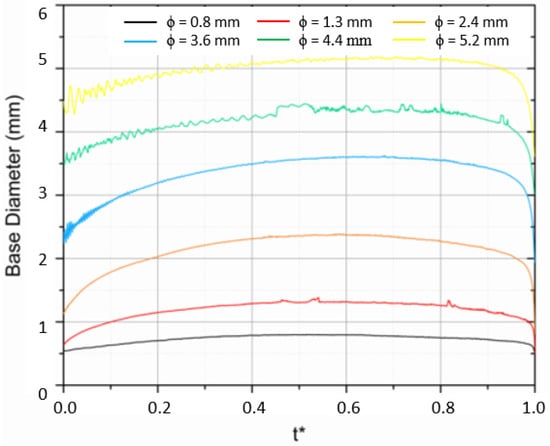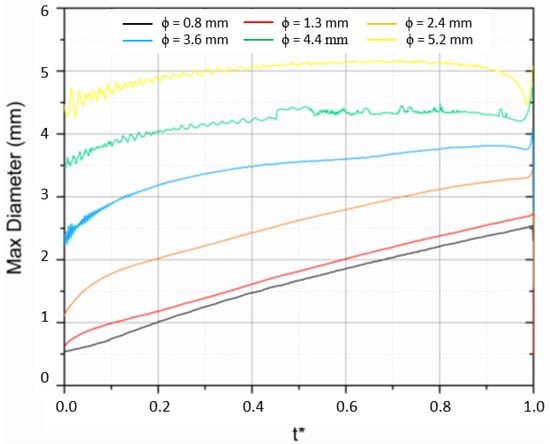 The plot in Figure 8 shows that the base diameter of the bubbles reached its maximum when the bubbles totally occupied the corresponding superhydrophobic regions. These results are consistent with the findings of published studies, suggesting that the base diameter of the bubbles is closely related to the area of the superhydrophobic region []. It can be stated that the base of the bubbles is confined to its corresponding superhydrophobic region, which is consistent with the reported results, for instance, by Teodori et al. []. However, after the vertical elongation stage in the smaller superhydrophobic regions, the bubble grows radially and reaches a dimension that is higher than that of the base. This fact is not noticeable in the larger superhydrophobic regions. Nevertheless, it is possible to verify that the base diameter has its lowest values at the beginning and at the end of the bubble nucleation process, and this effect is more noticeable in the case of bigger bubbles. In addition, in our experiment, the base diameters of the bubbles in all superhydrophobic regions underwent an initial increase until they momentarily stabilized in a near-plateau region. After that, the base diameters decreased in the final stages of the development of the bubbles until the detachment of the bubbles from the heat transfer surface. The period that the base diameter stayed approximately constant increased as the size of the superhydrophobic region decreased. It is also possible to verify from this plot, as well as from the plot in Figure 9, that the larger the size of the bubble, the bigger the plot line noise. This is likely due to the interference of the preceding bubble in the case of the bigger bubbles. This effect is somewhat attenuated along the development of the new bubble. Figure 9 depicts the mean evolution of the maximum diameter of the bubble over time. This figure shows, in detail, the marked difference in the maximum diameter evolution for the superhydrophobic regions with distinct diameters. It is possible to verify that for the larger superhydrophobic regions, the almost-linear increasing trend in the maximum diameter of the bubbles is gradually replaced by a trend like that of the base diameter evolution over time, which is depicted in Figure 7. The maximum diameter of the bubbles progressively increased and reached, or even surpassed, the value of the corresponding base diameter in the hemispheric growing stage around t* = 0.4 for all the superhydrophobic regions. The slope of the curves seems to be approximately constant until the stages before the departure of the bubbles. The departure can be identified by the steeper decrease in the maximum diameter at around t* = 1. Additionally, the bubbles had their biggest enlargement in the smallest superhydrophobic circular region with a diameter of 0.8 mm, where the mean maximum diameter reached 2.5 mm, which is more than three times greater than the diameter of the corresponding superhydrophobic region.