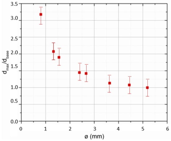 Comparative evolution of the ratio between the maximum diameter of a bubble at departure and its base diameter in the superhydrophobic regions with different diameters (0.8 mm, 1.3 mm, 1.5 mm, 2.4 mm, 2.6 mm, 3.6 mm, 4.4. mm, and 5.2 mm).