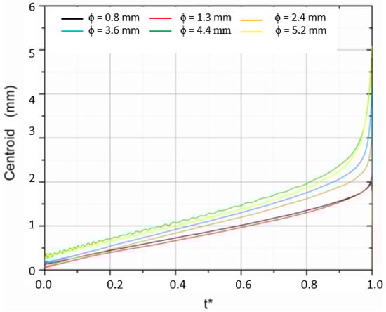 Furthermore, in the plot in Figure 11, we can observe the mean evolution over time of the centroid height of the bubbles at the departure stage. We noticed a linear increase in the centroid height of the bubbles until a nondimensional time of 0.85 for all the evaluated superhydrophobic regions. For time values superior to 0.85, all the curves adopted an exponential progress until the departure of the bubbles from the heating surface. In fact, in the necking stage, the height of the geometrical center of the bubbles grew exponentially during the short period of 0.95 < t* < 1, until the departure of the bubbles took place. Moreover, the height of the centroid at the departure stage had an average value of 3.5 mm. It was also verified that the height of the centroid evolution was independent of the imposed heat flux value.