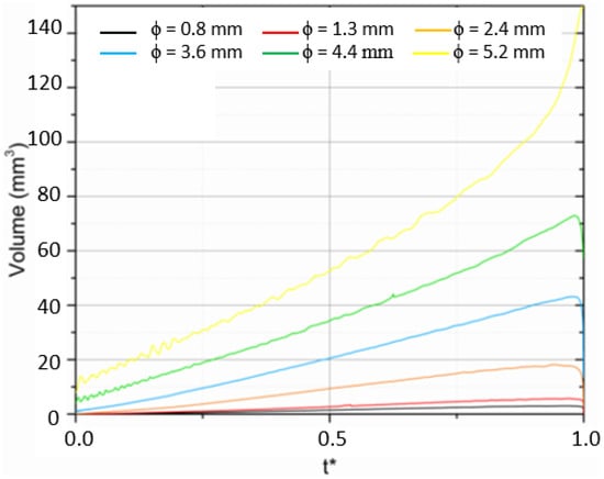 As expected, the values of the height of the centroid of the bubbles at departure were higher for the bubbles nucleated in the larger superhydrophobic spots. However, there were some inconsistent centroid height values during the formation of the bubbles in the different superhydrophobic regions. These discrepancies may have arisen from the developed MATLAB code. The plot in Figure 12 presents the evolution over time of the mean volume of the bubbles.