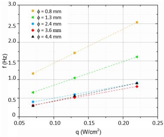 Comparative evolution of the mean departure frequency of the generated bubbles in superhydrophobic regions with different diameters (0.8 mm, 1.3 mm, 2.4 mm, 3.6 mm, and 4.4. mm) according to the imposed heat flux.