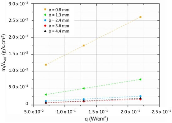 where is the evaporation mass per unit of time, ASHF is the area of the superhydrophobic region, ρv is the vapor density, f is the departure frequency of the bubbles, Vb is the estimated volume of the bubble, estimated by a spherical approach using the diameter of the bubble at departure, and Φ is the diameter of the superhydrophobic region. The trend displayed in the plot in Figure 13 is more pronounced in the plot in Figure 14. In the latter, it is possible to observe that the superhydrophobic region with the smallest diameter, 0.8 mm, presented an evaporation mass transfer rate appreciably higher than the rest of the superhydrophobic regions. Therefore, the superhydrophobic region with smaller dimensions was the one that displayed the best performance and the largest contribution to the latent heat fraction that can be removed from the heating surface.
