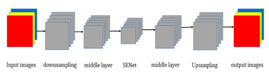 An SENet (Squeeze-and-Excitation network) [28] is an attention mechanism. The model can be inserted into CNN models with a low overhead. Its key features are strengthened to improve the quality of the generated images. Figure 2 is the structure of an SENet, which mainly consists of two parts: Squeeze (Figure 2 ) and Excitation (Figure 2 ). These two parts complete the adaptive scale of the feature channel.