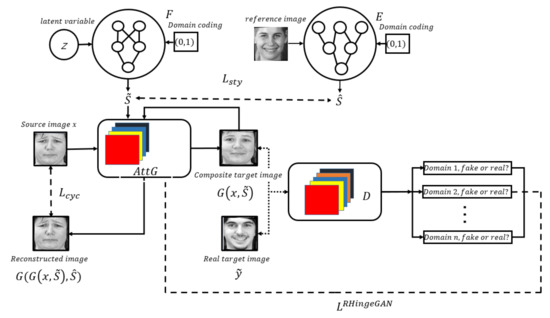 - Choi, Y.; Uh, Y.; Yoo, J.; Ha, J.W. StarGAN V2: Diverse Image Synthesis for Multiple Domains. In Proceedings of the 2020 IEEE/CVF Conference on Computer Vision and Pattern Recognition (CVPR), Seattle, WA, USA, 13–19 June 2020; pp. 8188–8197. [Google Scholar]