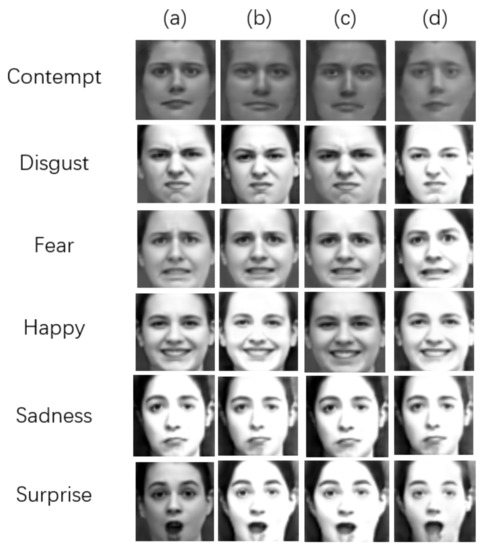With the advancement of multimedia technology, the facial expression recognition technique is universally used in social life. Due to various reasons, some existing facial expression datasets have insufficient data and unbalanced sample distributions. With an increase in the network’s scale, the network also increases its number of parameters. The over-fitting phenomenon would appear in the network because the facial expression datasets are limited. Therefore, data enhancement is necessary. Some examples of traditional image augmentation methods are geometric transformation [39] and color space transformation [40]. Xin et al. [41] used a single sample face image for facial reconstruction. The reconstructed facial image and original counterpart were treated as a new training sample set. The effectiveness of the algorithm was proven by a commonly used database. Ramasubramanian et al. [42] presented an automatically generated 3D facial model. Majid et al. [43] proposed a triple dynamic clipped histogram equalization (TDCHE) method. Traditional image enhancement approaches have good outcomes for some aspects. However, these approaches are mainly dependent on manual design and do not have the ability for autonomous learning. In addition, the images generated by traditional image enhancement methods have a high similarity.