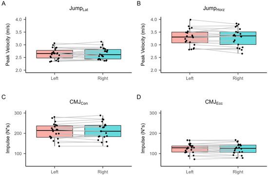 Box and whisker plots of interlimb dominance in jump performance under different conditions: (A) JumpLat, single-leg lateral jump; (B) JumpHorz, single-leg horizontal jump; (C) CMJCon, countermovement jump concentric phase; (D) CMJEcc, countermovement jump eccentric deceleration phase.
