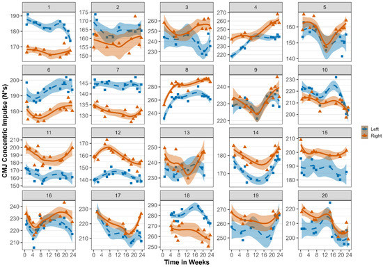 Within-limb variation in countermovement jump concentric phase impulse for (n = 20) participants that completed >10 monitoring sessions in-season. Shaded area represents confidence interval set to a level of 0.8.