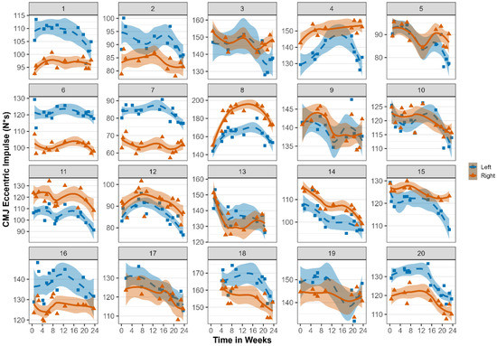 Statistical modelling showed that CMJCon impulse did not change meaningfully in our sample of speed skaters from baseline to end of season. CMJEcc impulse decreased throughout the season, with changes of −8.4 N*s and −5.3 N*s between the left and right limbs, respectively. Considering a CV of ~5% for CMJEcc, this change would seem meaningful for an athlete producing a 100 N*s impulse on each limb. Speed skating is predominated by isometric and concentric muscle actions, and it is plausible that the increasing proportion of training hours spent on-ice throughout the season could have contributed to this phenomenon. Future work may utilize dynamometry to examine within-season changes in eccentric strength of the lower limbs in these athletes more conclusively. Nevertheless, we observed an interlimb change of 3.12 N*s which favored the right limb, which would fall below the CV values reported above. This suggests that interlimb impulse for either phase of the CMJ does not change meaningfully in speed skaters during the competitive season. Visual inspection of Figure 3 and Figure 4 lend credence to this conclusion, where it seems that athletes tended to present similarly (either symmetrical or asymmetrical) throughout the 24-week season.