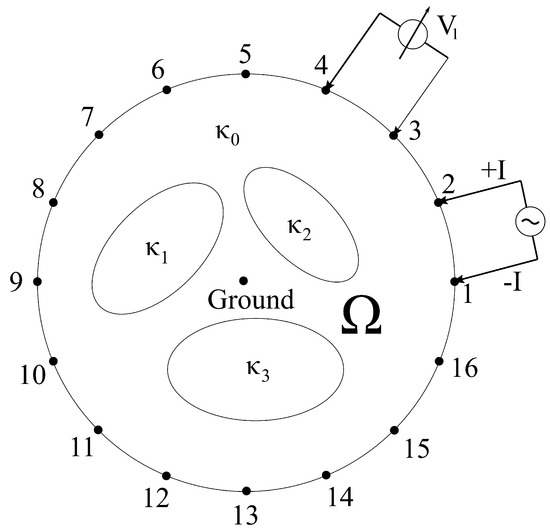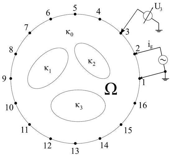 A typical EIT setup consists of 16 electrodes placed in a plane on the boundary surface, equidistant from one another [1]. During the data collection procedure, both the excitation and measuring electrodes are switched (multiplexed), hence after each measurement, the location of these electrodes changes (is further shifted) until the starting position is reached. Certainly, many electrode configurations can be proposed, where the recommendation is to use the configuration suitable for the determined application [1]. Excitation is often implemented using a current generator [1]. During the measurements, the voltages are registered from the electrodes placed on the surface of the investigated material. To implement the proposed algorithm for the most general data collection strategy, the so-called adjacent pattern, or the Sheffield method [1], has been chosen as proposed by Holder et al. [1].