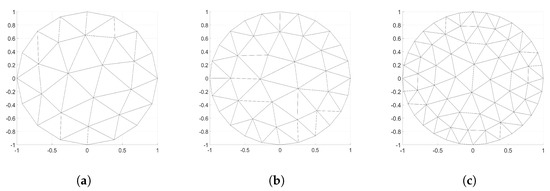The applied meshes used for case studies, (a) triangular mesh with 16 electrodes (, , , ), (b) triangular mesh with 24 electrodes (, , , ), (c) triangular mesh with 32 electrodes (, , , ).