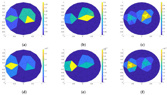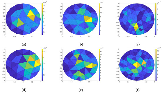 The spatial distribution of the relative error calculated using Equation (18) for each triangle; (a) for 16, (b) for 24, (c) for 32 electrodes, (d) for 16, (e) for 24, (f) for 32 electrodes.