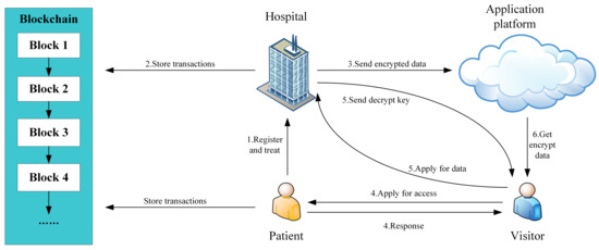 Hospital: Hospital collects patients’ medical data and submits their digests to the blockchain. After the patient is discharged, the hospital encrypts and submits the medical data to the application platform. When a visitor obtains permission from the patient, he needs to send the corresponding authorization information to the hospital. The hospital then sends the decryption key to him through a secure channel.