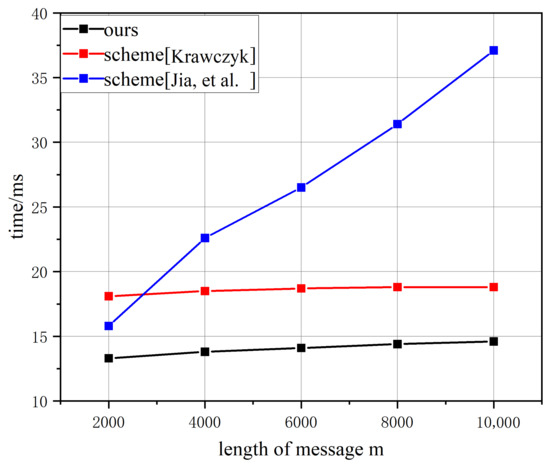 The chameleon hash based on the elliptic curve group is proposed in Section 3.1, and its computational cost is analyzed in this section. We implemented the chameleon hashes as described in our scheme and the scheme of [35,36] on the same computer and software. As shown in Figure 6, we compare the computational cost of our scheme and schemes of [35,36]. In [35], a discrete logarithm was used to build a chameleon hash, while the latter proposes an RSA-based chameleon hash. We test the time token for computing the chameleon hash with different lengths of message m. It can be seen that under the condition that the length of message m exceeds 3000, the time cost in our scheme is the lowest. Therefore, our scheme has higher efficiency in computing the chameleon hash.