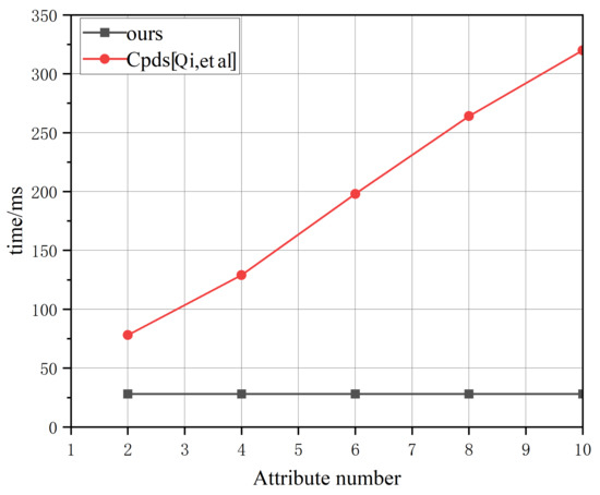 The time taken for the data owner to approve a visitor’s request is tested in this section. As shown in Figure 7, the time overhead of permission acquisition in [26] is proportional to the number of attributes. However, in our system, the computational cost of permission acquisition is almost constant. This is because, unlike the system of [26] that uses the key generation algorithm in attribute-based encryption to distribute permissions, the permission acquisition in our system only needs to calculate a collision of the chameleon hash.
