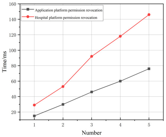 Next, we test the time overhead of permission revocation in our system. The results are shown in Figure 8. Multiple experiments are conducted to measure the time consumption for different times of revoking permissions. It can be seen that the time spent on revocation increases with the number of revocations, and the time for a single revocation does not exceed 30 ms. Therefore, we think that this time overhead is acceptable in our system.