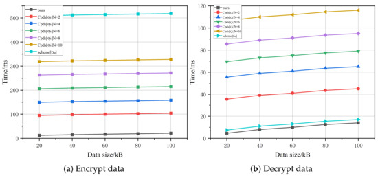Figure 9b shows the decryption time of the system of [26,27]. In the system of [26], the decryption is divided into two stages: symmetric decryption and attribute-based decryption. In the system of [27], symmetric decryption and ElGamal decryption are required. It can be seen from the figure that the decryption time of the system of [26] is proportional to the number of attributes and the size of the data, while it is only related to the size of data in the system of [27]. In our system, only symmetric decryption is required, resulting in higher efficiency compared to the existing systems.