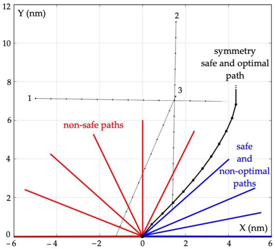 The novelty of this article is the synthesis and analysis of the symmetry of the safe and optimal ship path in the vicinity of other ships, taking into account both the subjectivity of the navigator in the situation and the limitations of dealing with the need to follow the COLREGs maneuvering rules (Figure 2).