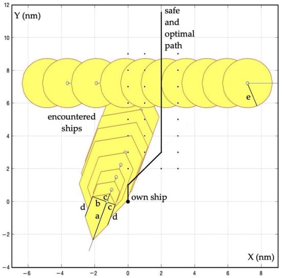 where L and B represent the own ship’s length and breadth; Ds and Ts are the distance and time to safe approach; and Vj is the encountered j ship velocity [43].