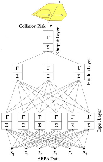 The neural network acts as a classifier of the degree of risk of collision with passing ships. The designed classifier is a three-layer unidirectional artificial neural network with six neurons in the input layer, three neurons in the hidden layer and one neuron in the output layer (see Figure 4).