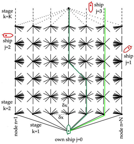 Dynamic programming grid consisting of K stages and N nodes with end conditions in the form of final course and final point of the cruise path: k = 1, 2, …, K is number of stages; n = 1, 2, …, N is number of nodes; j = 0, 1, 2, …, J is number of ships; δx is the distance between nodes, which determines the density of the grid.