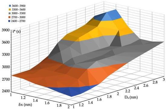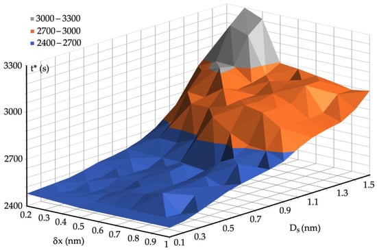 Dependence of the minimum safe and optimal ship path time, t*, with good visibility at sea on the safe passage distance (Ds) and the grid density (δx).