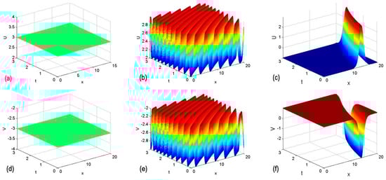 The Jacobi cd-function solutions of (the upper row) and V (the lower row) to the coupled KdV equations with variable coefficients when (a,d), (b,e), and (c,f), respectively. Other parameters are the same as those in Figure 1.