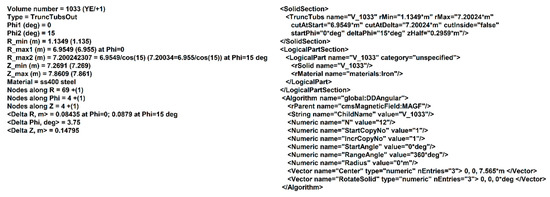 The description of volume shape parameters is made in XML format and contains geometrical dimensions, material type, and position in the CMS coordinate system. Geometrical dimensions of the volumes are described in azimuthal sector S1 and the coordinates of the volumes in other azimuthal sectors are obtained from sector S1 with the rotational symmetry.