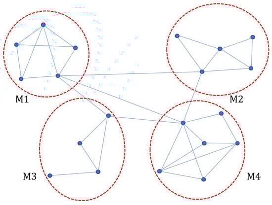 A specific brain network is taken up in this section. The connectedness of each module of this network is compared with the new parameter and calculated values. If , it indicates that the corresponding module is strong in terms of connectivity. The modular structure of the brain network is illustrated in Figure 1.