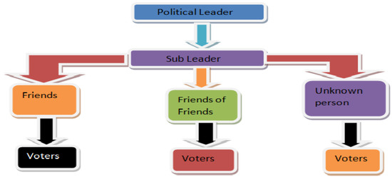 During election campaigns, political leaders must gather as much support as possible in a relatively short period of time. Obviously, in the case of regional or national general elections, it is impossible for the leader to personally know and persuade all his potential voters, and he must therefore create a hierarchical structure reporting to him and including smaller and smaller groups of people. We can assume that there is a central PFG who can carry out vote persuasion in his group. If a political leader meets a citizen and obtains his or her consent by showing that he or she is interested in his or her issues and problems, then it is very likely that the citizen will also persuade his or her family and friends to vote for that leader.