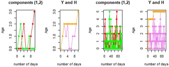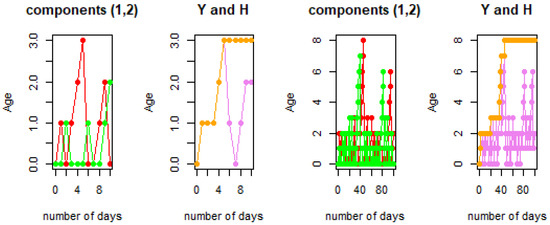 Figure 2 shows that the final altitudes of the two components are equal to one and two, respectively; thus, the final maximum age of the two components is equal to two. In addition, the age height is 4 at time 7, when and for the Moran walk of length 10.