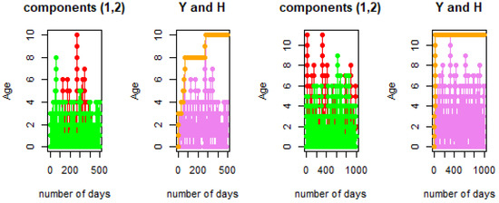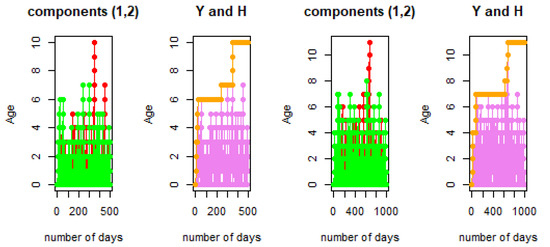 Figure 6 shows that the final altitude of , , and Y is equal to at most 4, and the final altitude of the height H is fixed at 10 for the Moran walk of length 500. When the length is increased from 500 to 1000, we observe that the final altitudes of , , and Y are moved a little and at most are equal to 6, and the final altitude of the height H is fixed at 11. It is clear that the height is bounded by eight by eleven. The maximum age of the two components is at most equal to 11.
