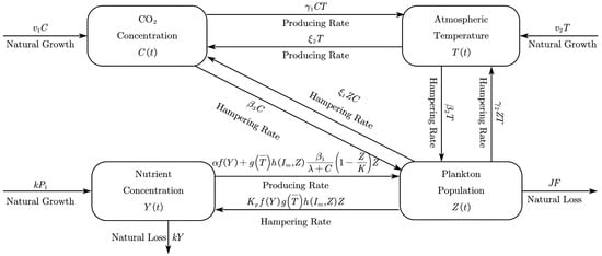 Biochemical reactions occurring in nature also generate new heat to raise the atmospheric temperature , and we set as the natural growth rate of atmospheric temperature. Since atmospheric temperature usually has a positive correlation with CO concentration [,,], we note that denotes the increase in atmospheric temperature caused by the increase in CO. Moreover, plankton can absorb CO through photosynthesis, so plankton can adjust the atmospheric temperature through photosynthesis [,,,], and the planktonic absorption of atmospheric temperature is noted as .