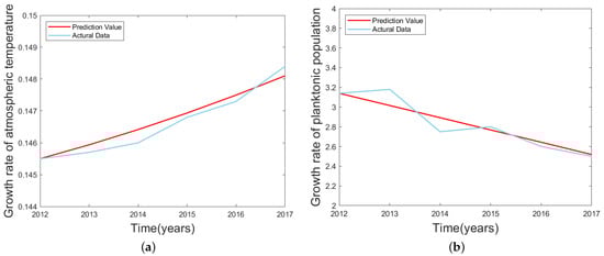 The findings imply that CO concentration in the atmosphere will steadily increase over the next 50 years, with a linear growth rate. The growth rate of atmospheric temperature will be exponential, and the greenhouse effect will further intensify. The growth rate of nutrient concentration in this sea area generally shows a steady growth of waves, because the increase in atmospheric CO concentration aggravates ocean acidification and deteriorates the growth environment of plankton population. Meanwhile, rising air temperatures have a deleterious impact on plankton’s capacity to absorb nutrients. For plankton, the growth rate of their population density shows an approximately linear decrease. The above results are consistent with the findings of numerous scholars [,,,,,,].