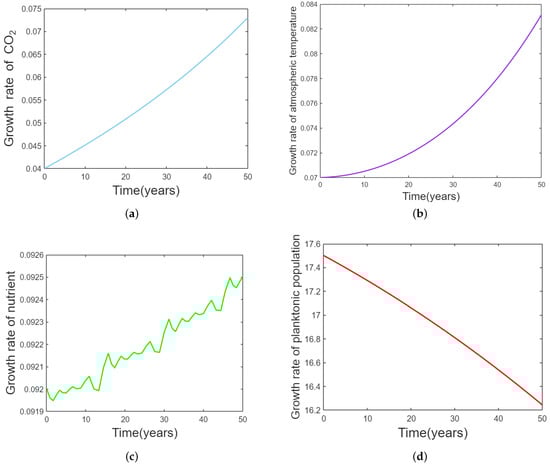 Simulation results of the nonlinear dynamics model for the plankton population. (a) The growth rate of atmospheric CO concentration over time. (b) The growth rate of atmospheric temperature over time. (c) The growth rate of nutrient concentration in the sea over time. (d) The growth rate of the density of the plankton population over time.