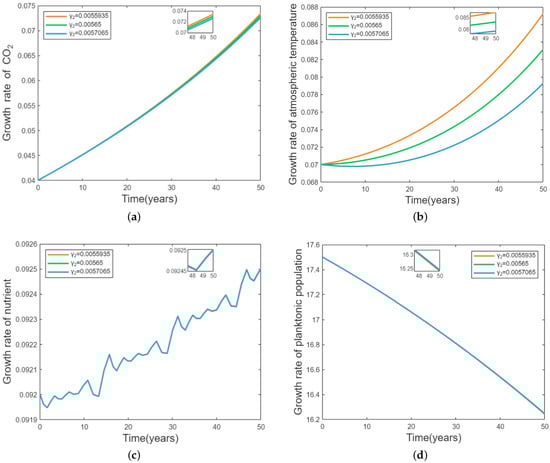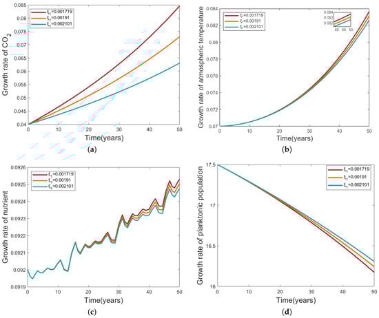 As depicted in Figure 5a, as increases, the growth rate of atmospheric CO concentration slows, although only slightly. Figure 5b indicates that the growth rate of atmospheric temperature is reduced significantly. However, the change in has little effect on the growth rate of nutrient concentration and the density of the plankton population in this sea area, as illustrated in Figure 5c,d. The results of the experiment are consistent with the academic research by [,,,,,,,].