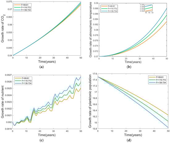 It can be observed from Figure 6a that when F decreases, the density of the plankton population grows, increasing the total absorption of atmospheric CO and causing the growth rate of atmospheric CO concentration to decrease. Figure 6b shows that when the rate of rise in CO concentration in the atmosphere slows, so does the rate of growth of atmospheric temperature. As F declines and the density of the plankton population grows, total nutrient absorption increases, and therefore, the growth rate of nutrient concentration in the marine area reduces, as illustrated in Figure 6c. Figure 6d illustrates that when F declines, the growth rate of the plankton population increases. The experimental results are in good agreement with academic studies by [,,,,,,,].