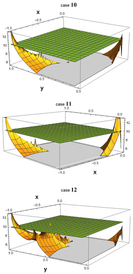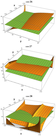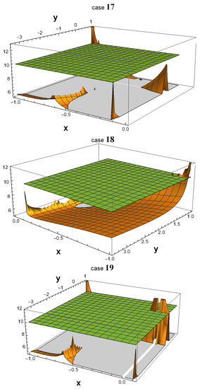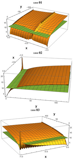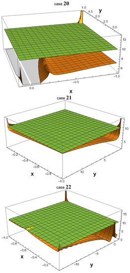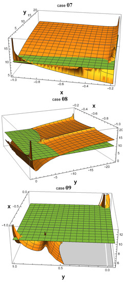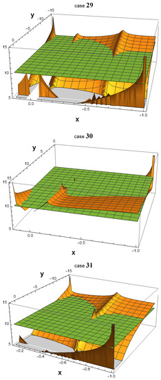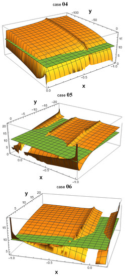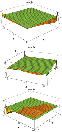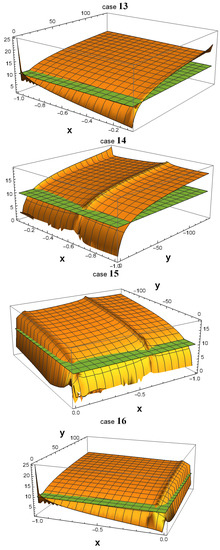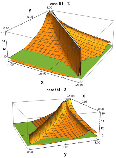 As shown in Figure 1, all 32 3D plots exhibit many areas in which . In some of them, a peak emerging from the green plane near the point () = (−1, 1) is observed. In fact, such a peak always exists in all 32 plots. The reason why one cannot see them in cases 01, 04, 14, and 15 is that they are hidden by the plot ranges of and in the software Wolfram Mathematica. However, if one zooms in on the area around () = (−1,1) as depicted in Figure 2, the peak becomes more noticeable.