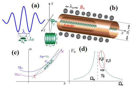 where is the “axial” relativistic Lorentz factor and is the dimensionless axial velocity. In this situation, the pulse according to the lower transverse mode TE11 can also be emitted, and there are two resonance frequencies in the intersection of the dispersion characteristics regime: