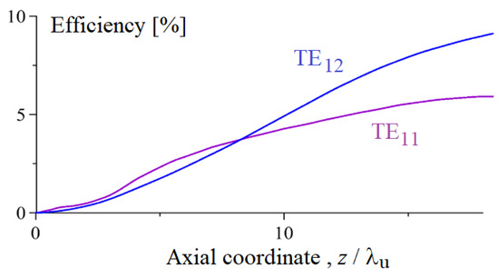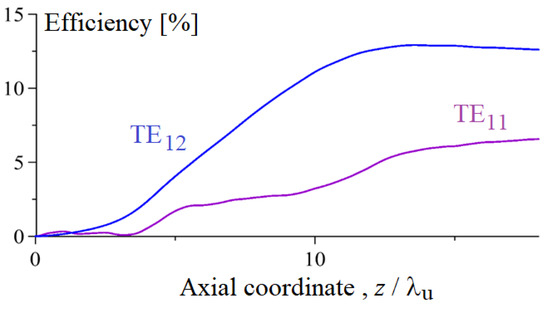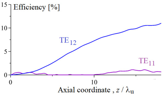 Efficiency of radiation as a function of the axial coordinate normalized to the undulator period. The blue curve accords to the efficiency of electron–wave interaction with the TE12 mode, and the purple curve is the efficiency of electron–wave interaction with the TE11 mode in the case of the total bunch charge of 0.5 nC and the initial duration of 0.5 ps.